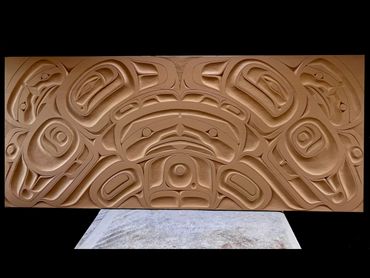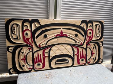 Working primarily with yellow cedar and red cedar, each panel, canoe paddle and mask is created in traditional fashion.